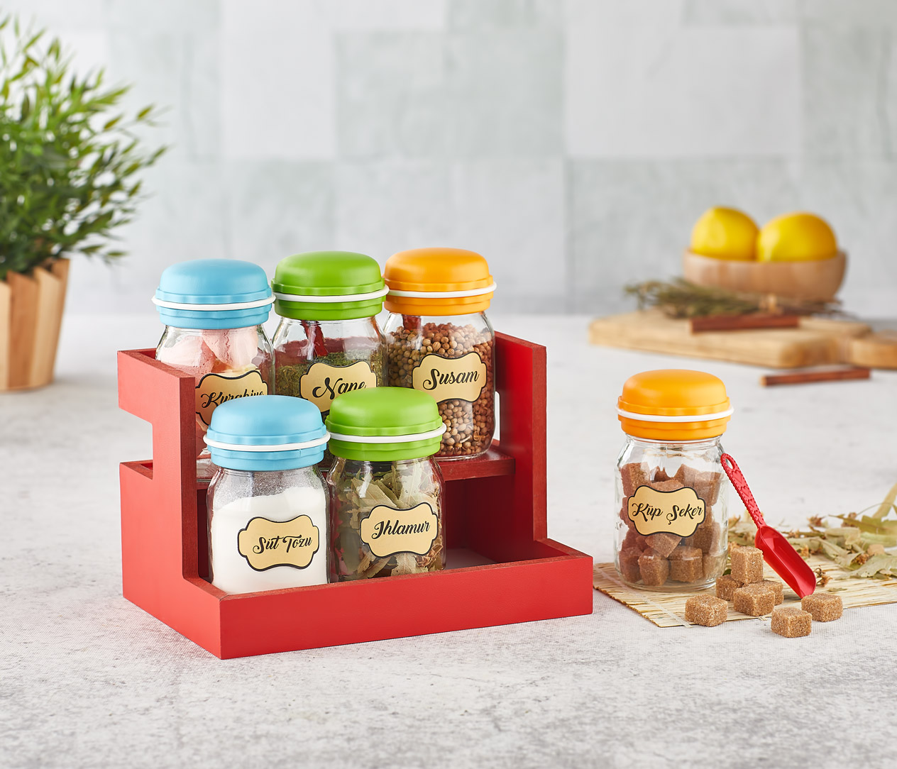 Panama Ahşap Standlı Makaron Baharatlık Seti 6x
